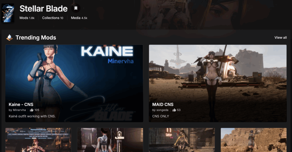 ステラーブレイドはMODもかなり活発で、NexusModsに数多くのMODが上がっています。着せ替えゲーということもあり服装追加がメイン。細かいところでは髪型や顔の造形をいじるもの、ゲームシステムの改変MODなど一通り揃っています。