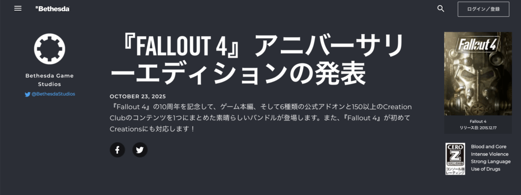 Fallout4の10周年を記念してAE版アップデートが発表されました。