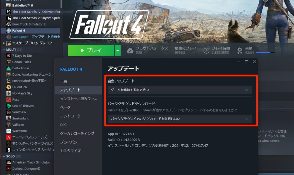 ①Steamの自動アプデを切る