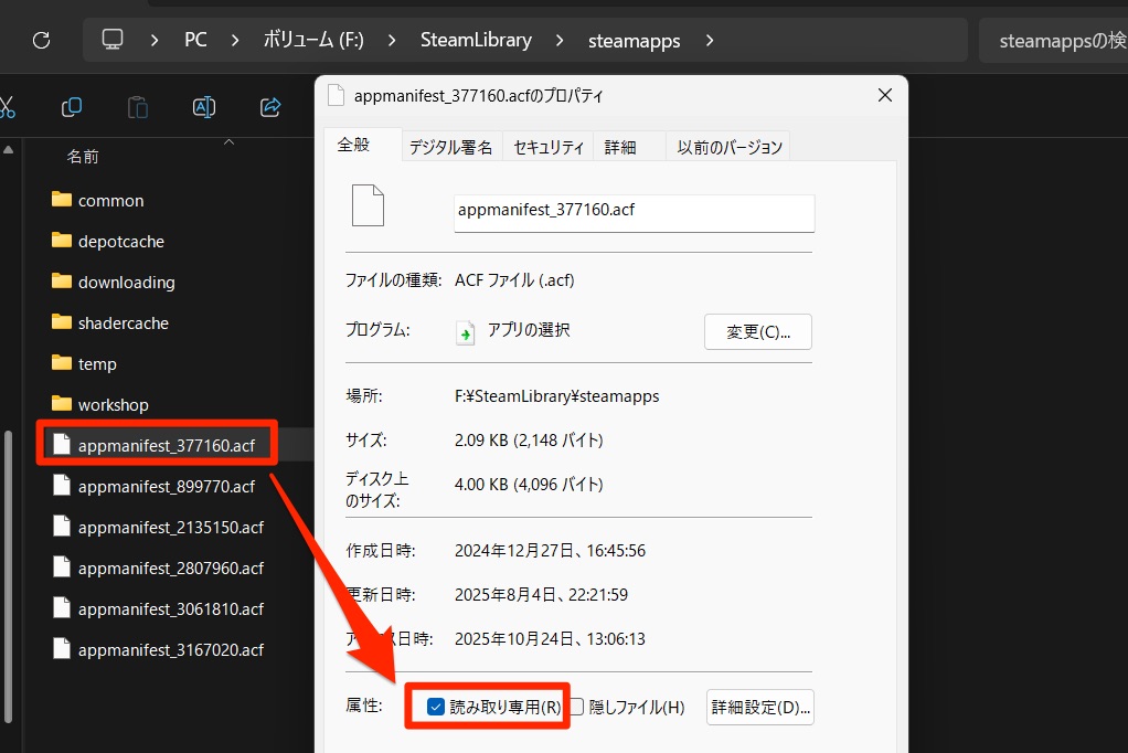 SteamLibrary\steamappsを開く appmanifest_377160.acfのプロパティを開き読み取り専用にする